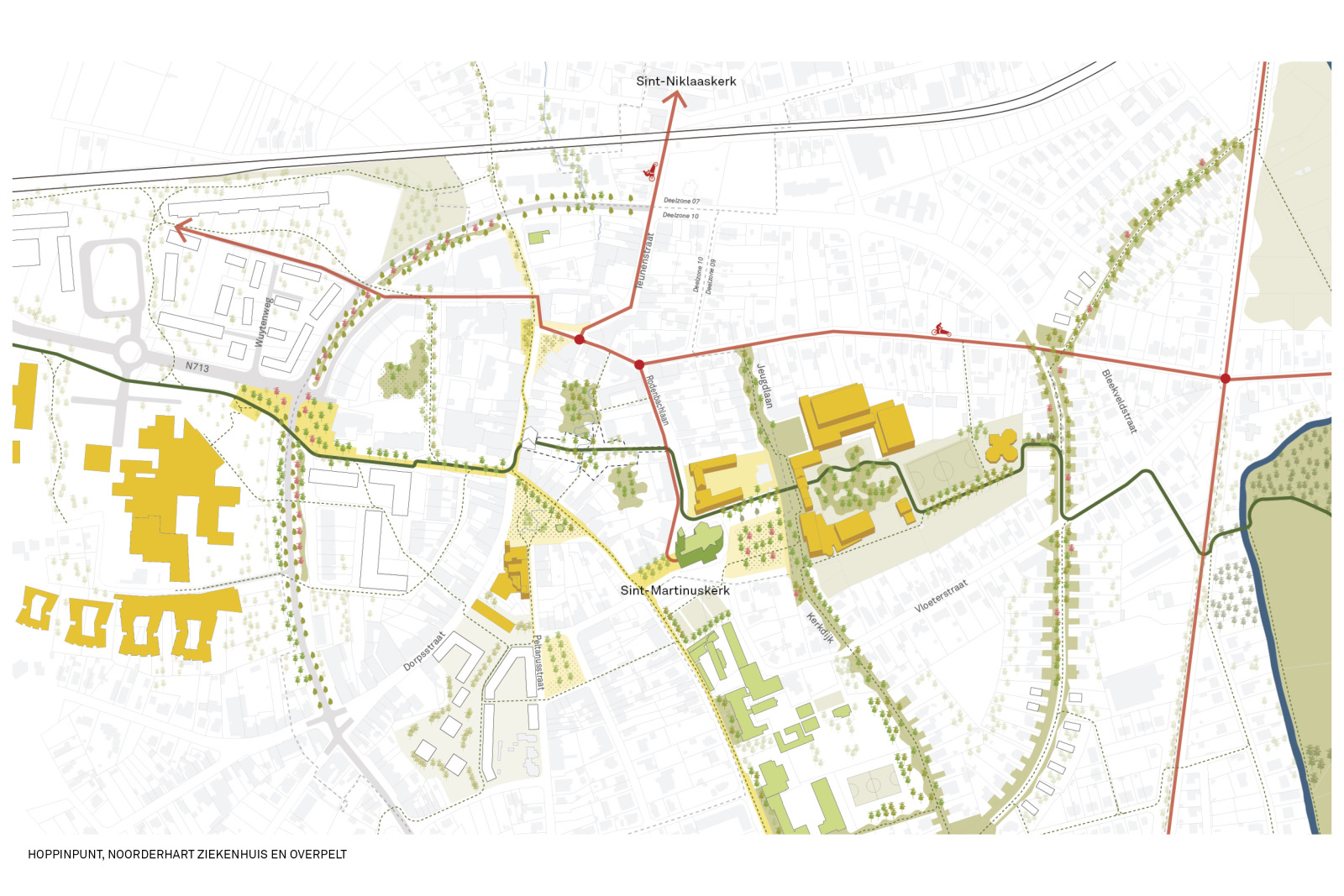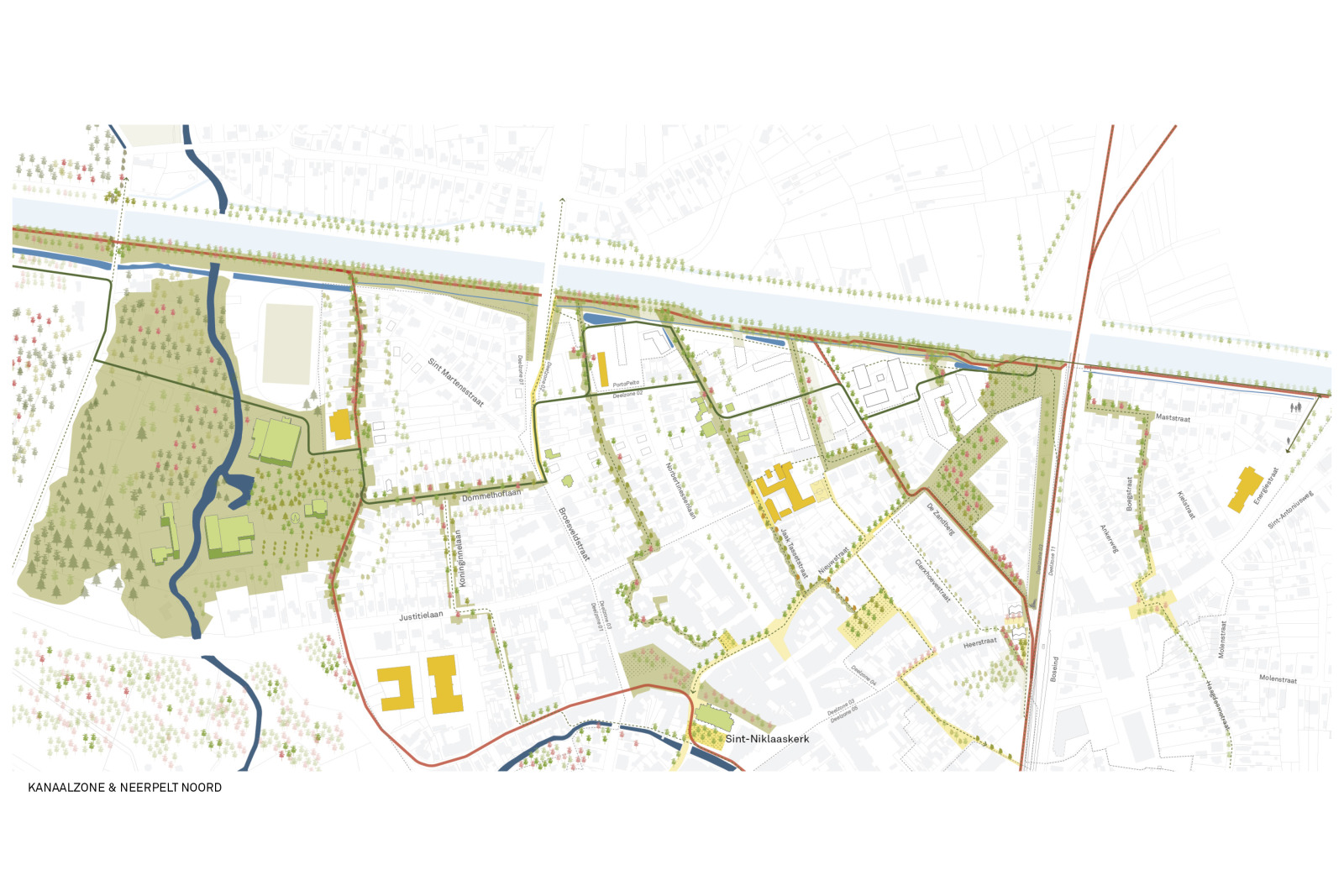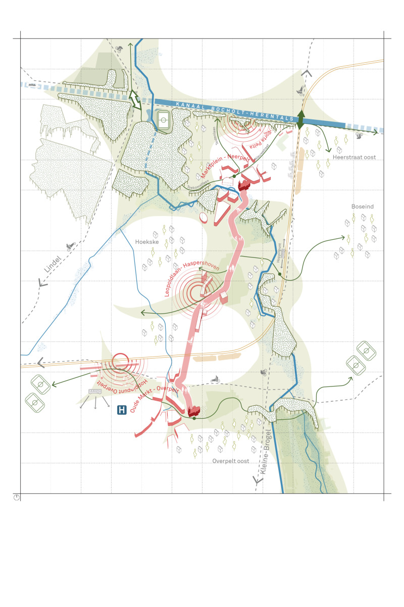 This center vision primarily outlines an ambition, a possible future image for the center of Pelt as a dynamic, livable, and resilient core. From an integrated urban and landscape perspective, this future image explores possibilities for densification and de-densification, the development of high-quality and climate-adaptive public spaces, and new networks of mobility. This research consciously focuses on strategic emphases and principles.