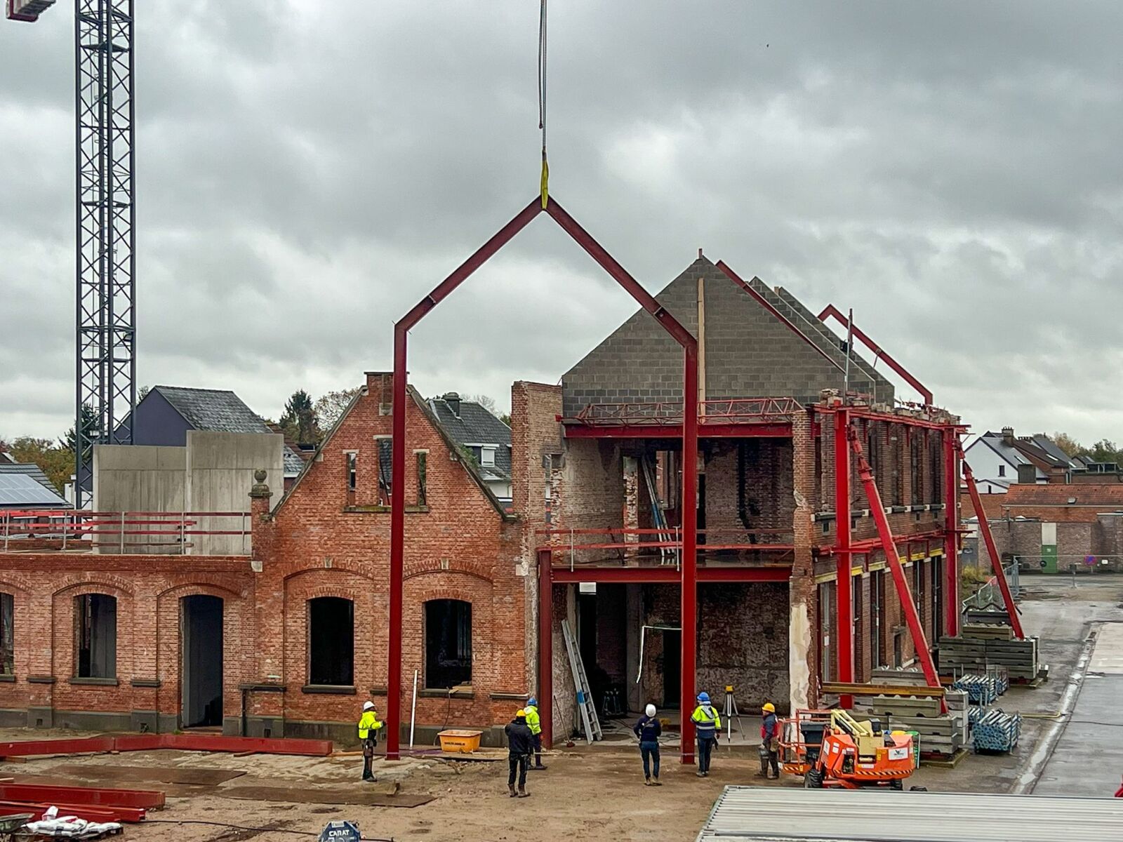 In Berlaar, we’re transforming a former school building into the new administrative center — and the construction is progressing rapidly. The large steel portals that will highlight the new entrance have now arrived on site.