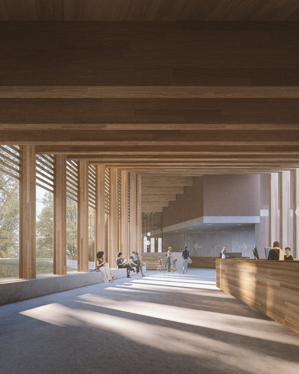 Church and new building are connected by a light, meandering wooden structure that weaves itself between the trees and links both volumes spatially and volumetrically. This connecting volume accommodates the public heart of the Huis van de Olenaar: a foyer for informal meeting, lingering and temporary uses such as exhibitions or receptions. Through the development of the site, a new dialogue emerges between building and landscape, breaking open the introverted character of the church. Church, new building, presbytery garden and cemetery merge into a single coherent landscape structure, with room for further greening of Boekel and a durable social anchoring of the project within the village.