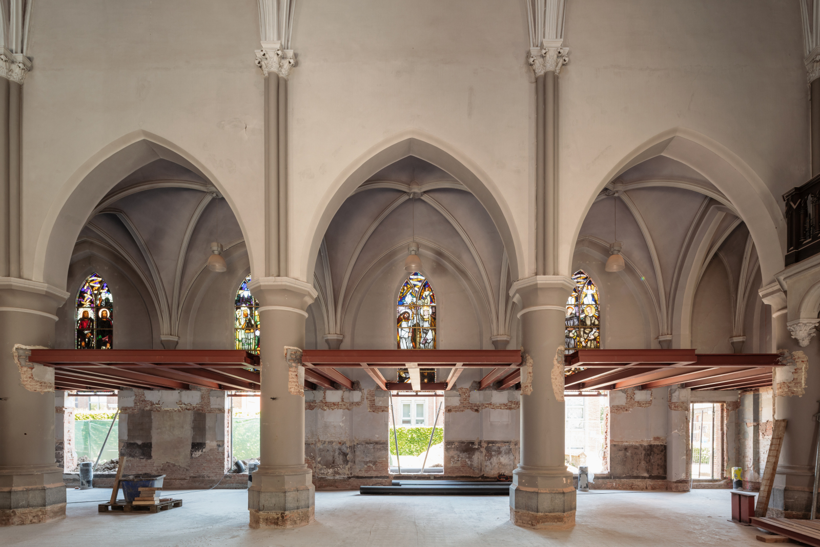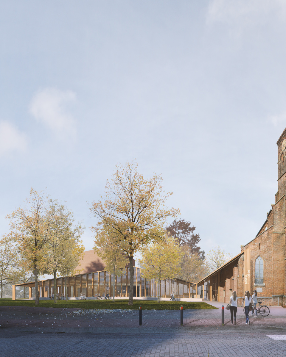 The design is based on a clear three-part concept and focuses on a flexible, sustainable and accessible public building that naturally embeds itself in its context and welcomes the people of Olen. The church is understood as a robust yet contemporary structure capable of accommodating new uses without losing its spatial qualities. To return the building to the community, a public function is chosen: the library. This programme is flexible and reversible, allowing the serenity, scale and spatial experience of the church interior to be preserved, without subdividing the space.