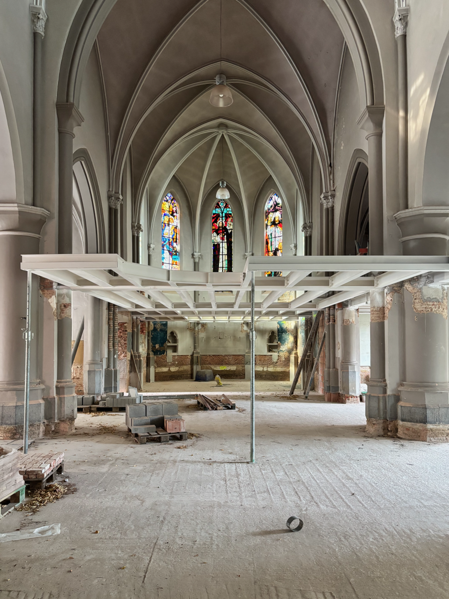 In the Church of Our Lady, a new internal steel structure provides additional space for the library and transforms the church into its new form and function.